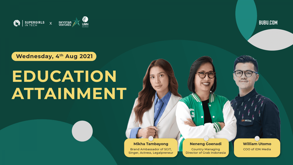 Jakarta, 4 Agustus 2021 – Setelah mengadakan kick-off pertamanya, Super Girls In Tech memulai rangkaian kegiatan inkubasi yang diawali dengan pemaparan mengenai pentingnya pendidikan di dalam masyarakat. Pemaparan ini dihadiri oleh tiga narasumber ahli, yaitu Mikha Tambayong (Legal Preneur), Neneng Goenadi (Country Managing Director of Grab), dan William Utomo (COO of IDN Media).